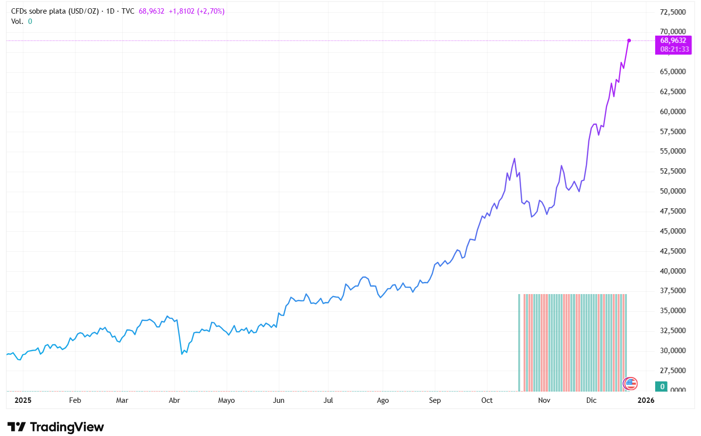 En 2025, algo curioso ha ocurrido con la plata: el metal precioso blanco, tradicionalmente visto como el “hermano menor” del oro, ha protagonizado uno de los rallys más espectaculares de los mercados de materias primas. En menos de un año, la plata ha pasado de cotizar alrededor de los 30 USD por onza a alcanzar cerca de los 69 USD por onza, marcando niveles nunca antes vistos y duplicando su valor en apenas doce meses. Esta subida, impulsada por una combinación de debilidad del dólar, expectativas de recortes de tipos en Estados Unidos y una demanda industrial robusta que supera a la oferta disponible, ha convertido a la plata en uno de los activos más observados por inversores este año.