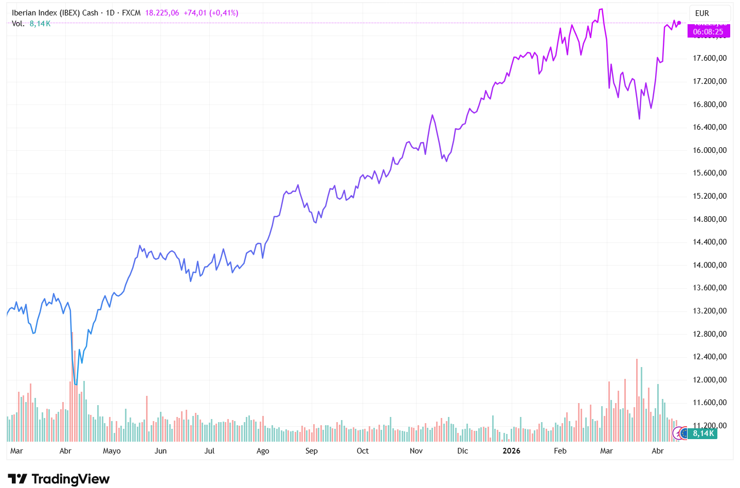 Pero abril ha sido otra película. Con las negociaciones de paz entre EEUU e Irán avanzando y el petróleo bajando hasta los 96 dólares, el Ibex ha rebotado cerca de un 4% en la última semana. El miércoles subió un 1,46% hasta los 18.286 puntos y ayer se tomo un respiro con una caída del 0,55%, cerrando en unos 18.185 puntos. A solo un 2,1% de sus máximos históricos del 27 de febrero. Vamos, que el índice ha resucitado más rápido que las series de Netflix.